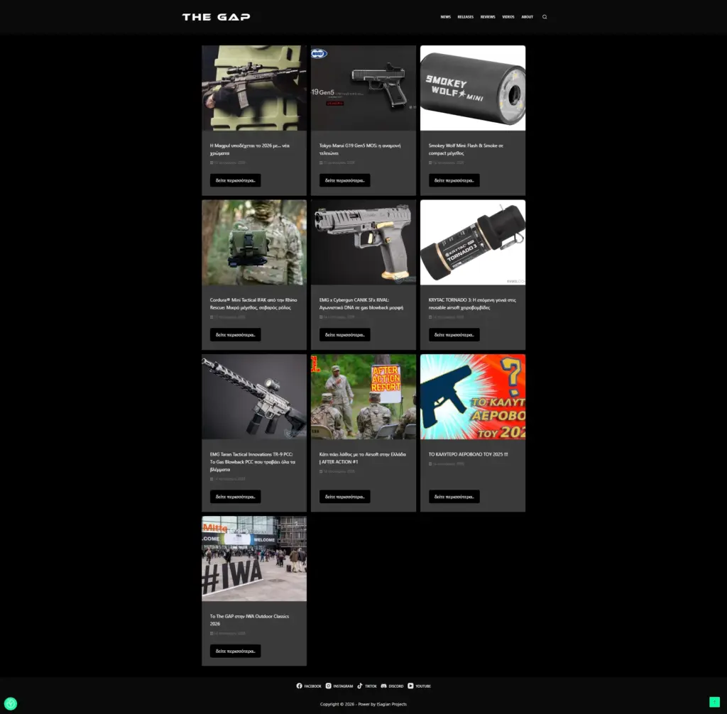 Το The GAP (The Greek Airsoft Project) είναι ένα Blog site όπου είναι αφιερωμένο στο airsoft, tactical και outdoor εξοπλισμό. Επίσης διαθέτει ενημερωτικό κανάλι σε YouTube, Instagram, TikTok και κοινώτητα στο Discord.