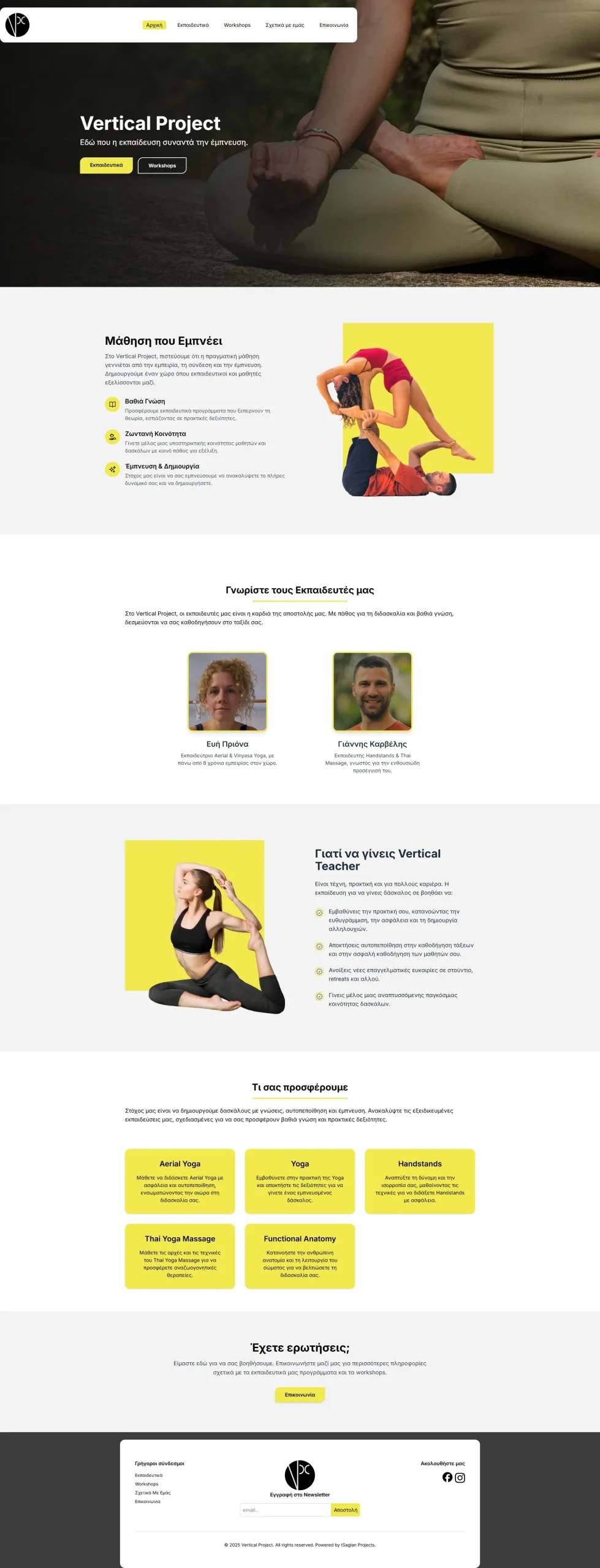 Το Vertical Project αναλαμβάνει την εκπαίδευση και πιστοποίηση δασκάλων γιόγκα μέσω ειδικών προγραμμάτων που καλύπτουν μια ποικιλία τεχνικών και προσφορών στον τομέα της γιόγκα και ευεξίας. Οι εκπαιδευτικές μας επιλογές περιλαμβάνουν τα εξής: